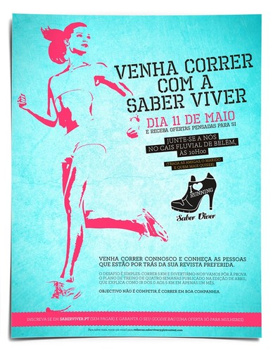 Como os meus três meses de ginásio gratuito já acabaram, todas as iniciativas são boas para manter a forma. Sugiro-vos então, a corrida da Saber Viver dia 11 de Maio, sendo que o ponto de encontro é no Cais Fluvial de Belém, em Lisboa, às 10h. Para se inscreverem só tem de preencher o formulário no site da revista (a inscrição é grátis).