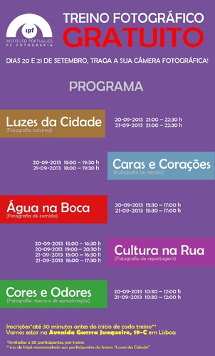O Instituto Português de Fotografia promove um treino fotográfico em várias áreas, sendo que as inscrições são grátis e limitadas a 20 participantes por treino. Podem inscrever-se: