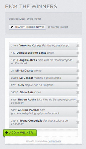 Os 10 vencedores já foram contactados e têm até segunda feira (2 de Dezembro) para responderem ao email que lhes enviei. Caso contrário irei sortear novos vencedores.