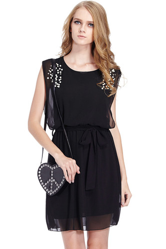 Beaded Self-tied Pleated Black Dress
