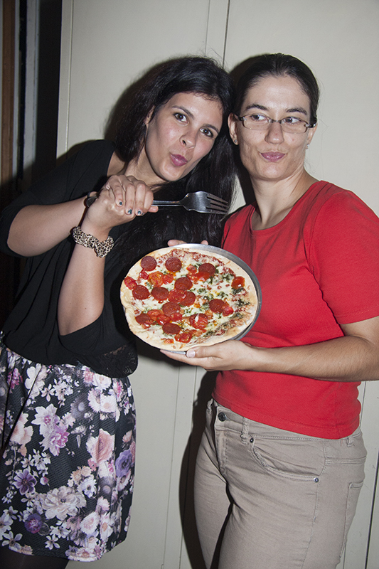 Na terça feira depois do estágio, reunimo-nos no meu terraço para o evento e só vos digo: foi altamente! A regra era cada pessoa trazer uma contribuição e entre sangria, sumos e comida a festa fez-se à grande! Começámos a festa com as pizzas salamino piccante e pesto, pizza quattro formaggi e pizza alla Parmigiana, mas confesso que a minha favorita é a primeira, no entanto as opiniões dividem-se.