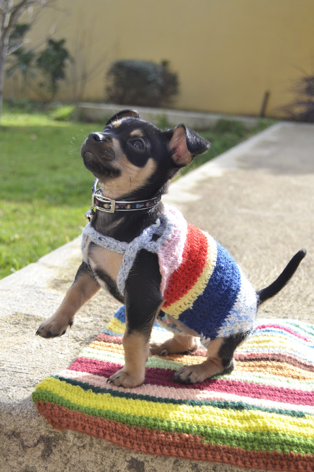 Finalmente, decidi procurar em lojas de animais, mas por uma simples camisola minúscula pediam-me 16 euros (caríssimo!). Assim, com alguns restos de lã e paciência, a minha mãe fez uma camisola e uma manta para a Júlia.