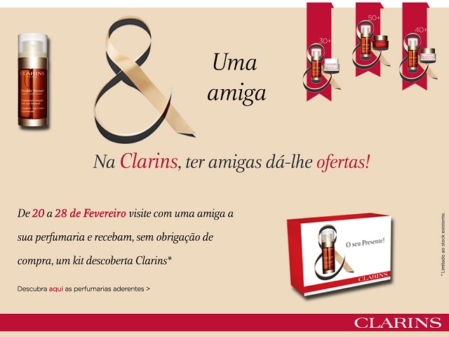 A Clarins está em festa, pois comemora-se o 1º aniversário do Double Sérum! De 20 a 28 de Fevereiro, se fizerem uma visita a uma perfumaria aderente a esta promoção, na companhia de uma amiga receberão as duas, sem qualquer compromisso de compra, um kit descoberta Clarins (limitado ao stock existente).