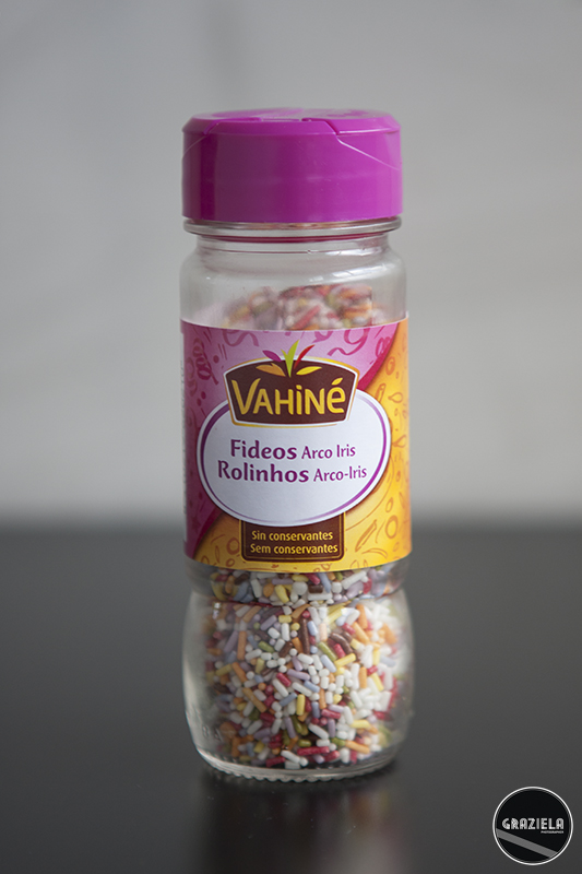 8. Barre o bolo com o preparado e decore com os rolinhos arco íris.