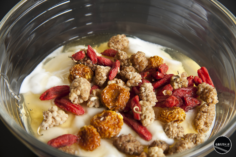 Para reforçar esta receita usei superalimentos (alimentos de alto teor em fitonutrientes com elevados benefícios para a saúde) da Föld. Mais propriamente o mix de Vitaminas e Minerais, que é constituído por Amoras brancas, Bagas de Goji e Bagas Inca. Contém um alto teor de Vitamina C, Vitamina A, Vitamina E, Zinco e Ferro. É indicado para reforçar o sistema imunitário, prevenir os sinais do envelhecimento e as doenças degenerativas. Perfeito para começar bem o dia!