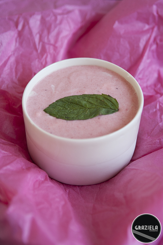 2. Numa taça misture os morangos, o queijo creme, as natas e o açúcar. Bata com a batedeira.