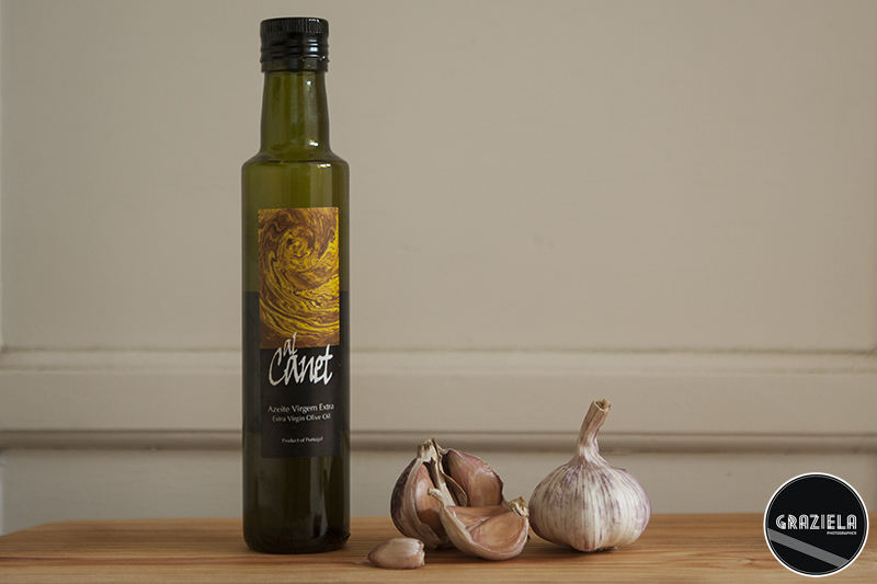 2. Deite o alho desfeito sobre o pão e regue com um fio de azeite.