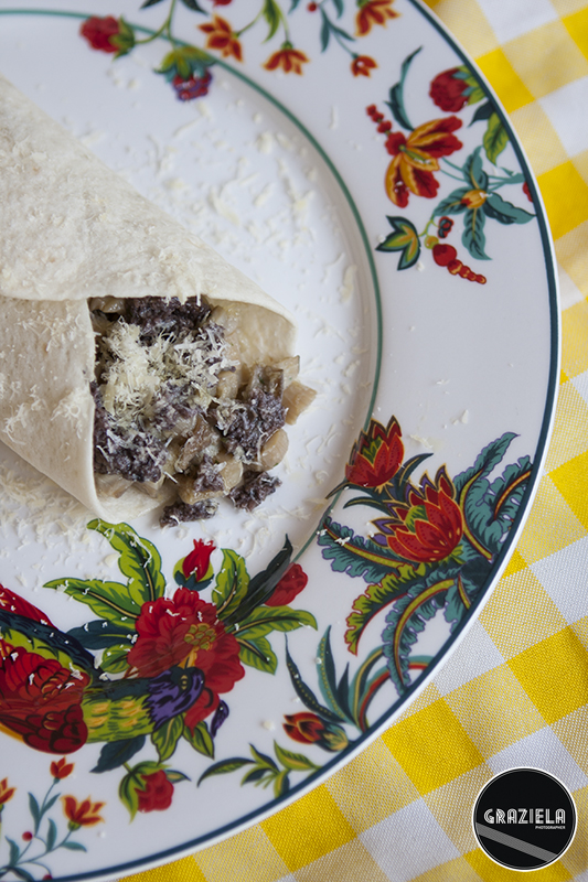4. Estenda o wrap e com ajuda de uma colher deite os cogumelos ao centro.