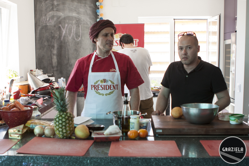 Depois passámos mesmo à fase da cozinha e qual não foi o nosso espanto quando ele nos diz que tinhamos 5 minutos para escolher os igredientes para o prato que iriamos cozinhar. Para além disso, o prato deveria conter obrigatoriamente dois ingredientes da Président.